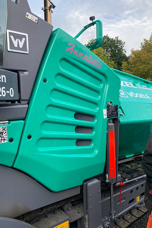 Unser Maschinenpark wurde erweitert. Der neue Vögele Fertiger „SUPER 1600 3i“ wurde kürzlich angeliefert und von uns bei Inbetriebnahme feierlich auf den Namen „Annabelle“ getauft.